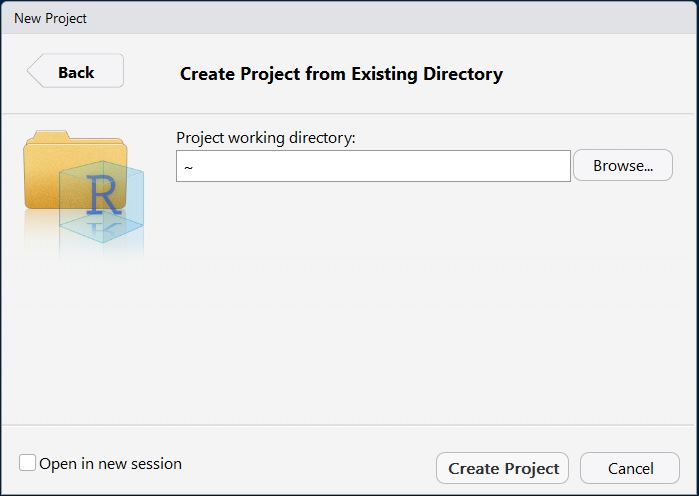 - En este caso, yo ya tengo carpetas con mis datos, por lo que seleccionaré la opción de Existing Directory. Al seleccionar esa opción aparece una nueva ventana, pidiéndome que indice el directorio al cual quiero asociar mir poyecto: